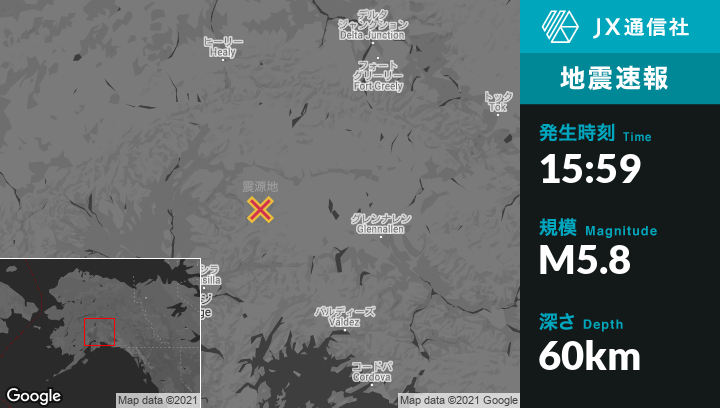 | 震源地 | アラスカのChickaloonから北73kmの地点 |