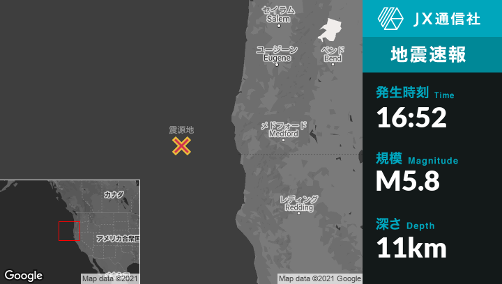 | 震源地 | オレゴンのGold Beachから西139kmの地点 |