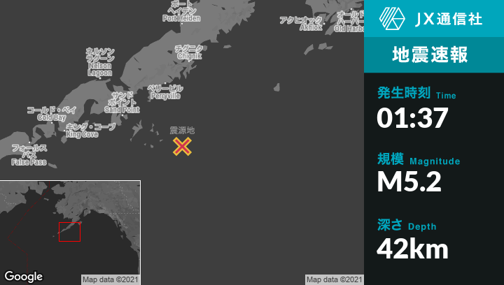 11月01日 01:37頃、アラスカのPerryvilleから南南東122kmの地点でM5.2の地震がありました。
