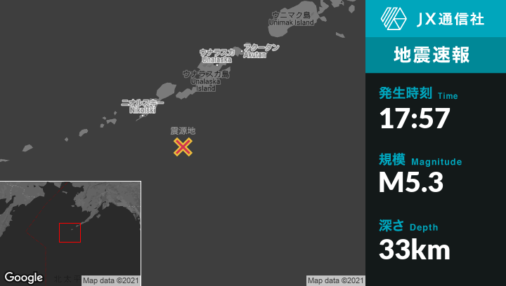 | 震源地 | アラスカのNikolskiから南東102kmの地点 |