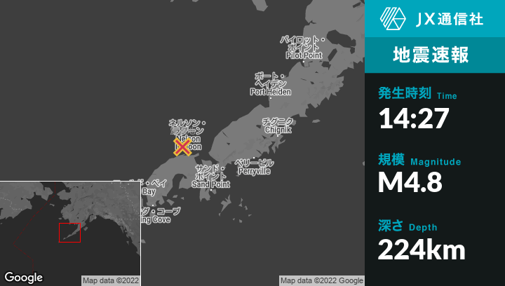 4月22日 14:27頃、アラスカのNelson Lagoonから北北西21kmの地点でM4.8の地震がありました。