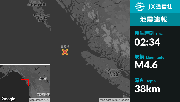 6月14日 02:34頃、カナダのPort McNeillから西192kmの地点でM4.6の地震がありました。
