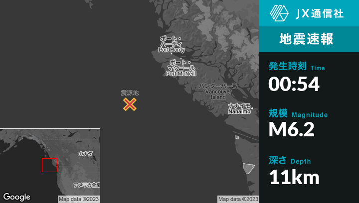 | 震源地 | カナダのPort McNeillから南西211kmの地点 |