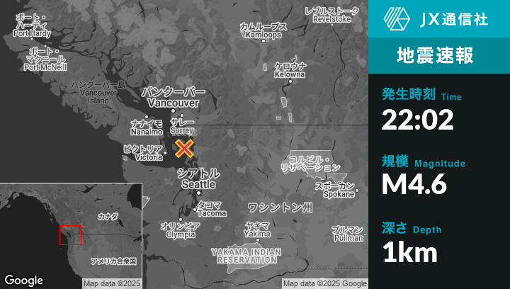 3月03日 22:02頃、ワシントンのOrcasから東12kmの地点でM4.6の地震がありました。