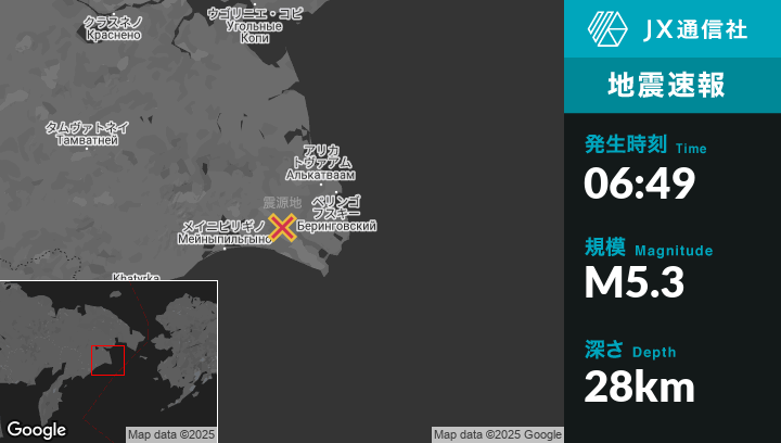 | 震源地 | ロシアのBeringovskiyから西南西63kmの地点 |