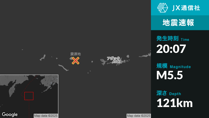 8月28日 20:07頃、アラスカのAdakから西235kmの地点でM5.5の地震がありました。