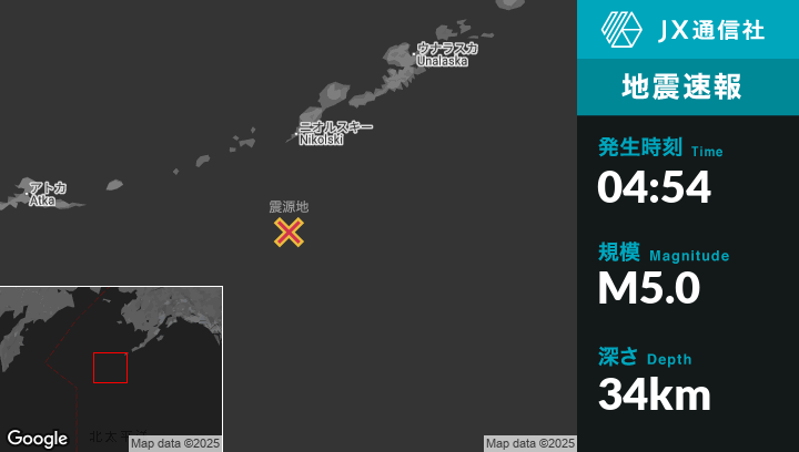 9月05日 04:54頃、アラスカのNikolskiから南124kmの地点でM5.0の地震がありました。