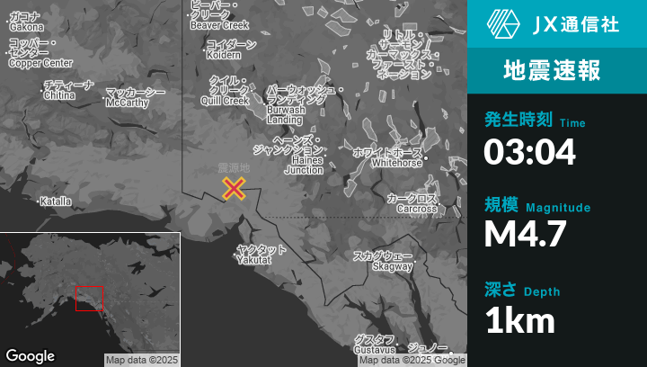 12月08日 03:04頃、アラスカのYakutatから北96kmの地点でM4.7の地震がありました。