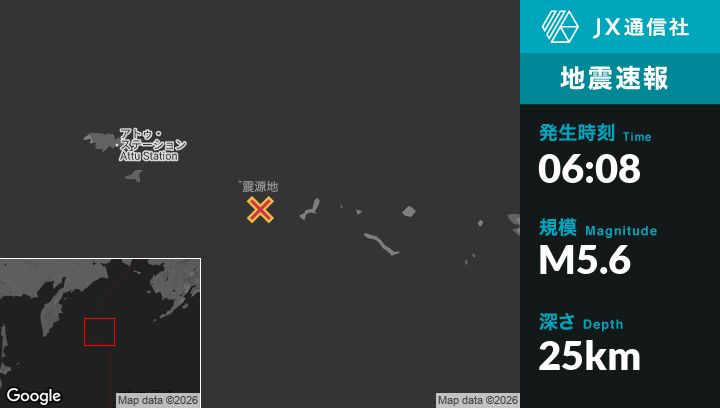 3月07日 06:08頃、アラスカのAttu Stationから東南東233kmの地点でM5.6の地震がありました。