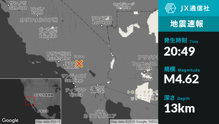 5月08日 20:49頃、カリフォルニアのCabazonから北11kmの地点でM4.62の地震がありました。