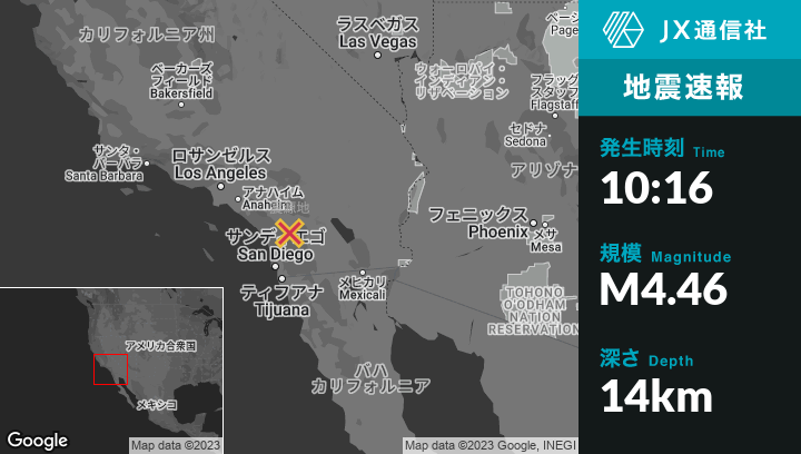 | 震源地 | カリフォルニア州のPalomar Observatoryから北西5kmの地点 |