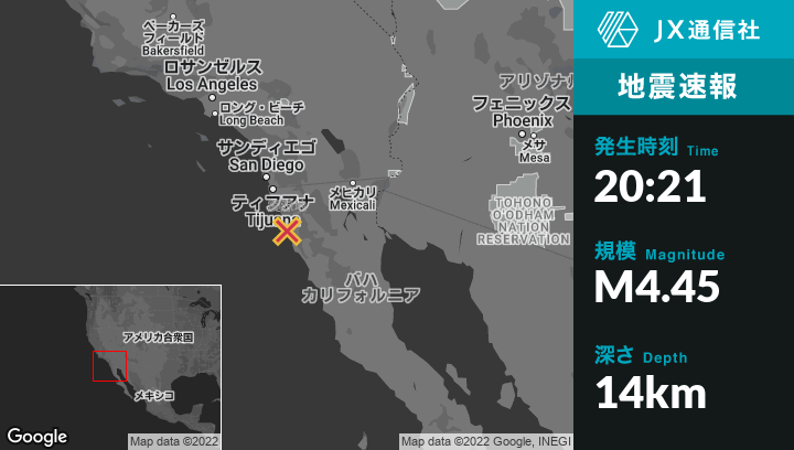 7月25日 20:21頃、BC、MXのEl Sauzalから西北西8kmの地点でM4.45の地震がありました。