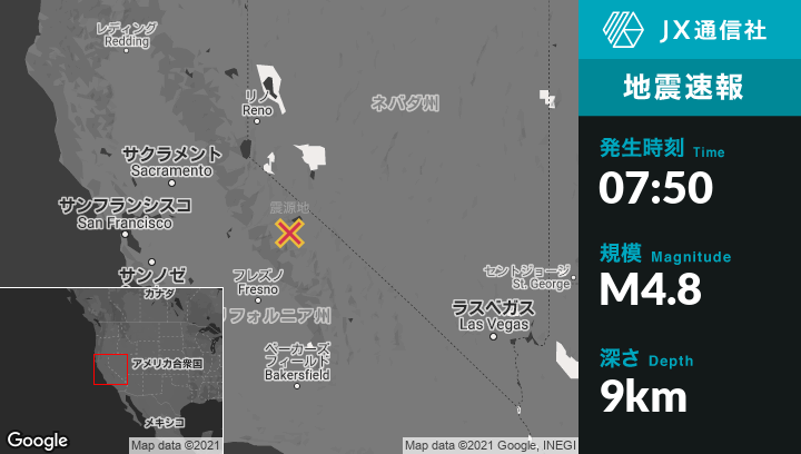 7月09日 07:50頃、カリフォルニアのLee Viningから南南西8kmの地点でM4.8の地震がありました。