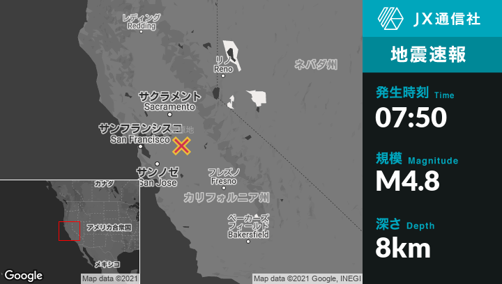 7月09日 07:50頃、カリフォルニアのFarmingtonから西南西11kmの地点でM4.8の地震がありました。