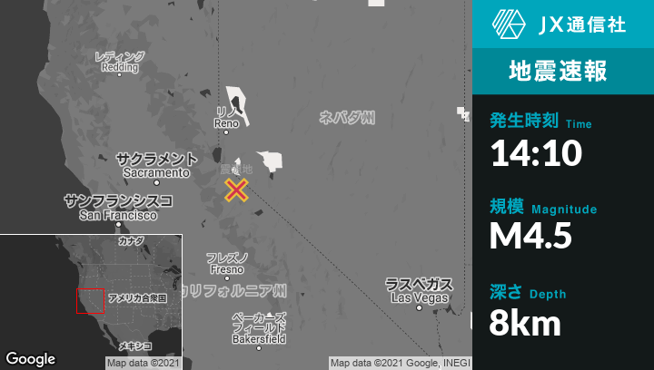 7月09日 14:10頃、カリフォルニアのColevilleから南西7kmの地点でM4.5の地震がありました。