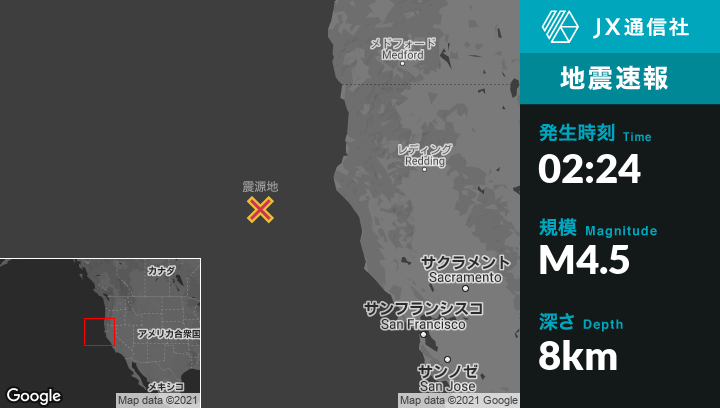 12月22日 02:24頃、カリフォルニアのFerndaleから西南西162kmの地点でM4.5の地震がありました。