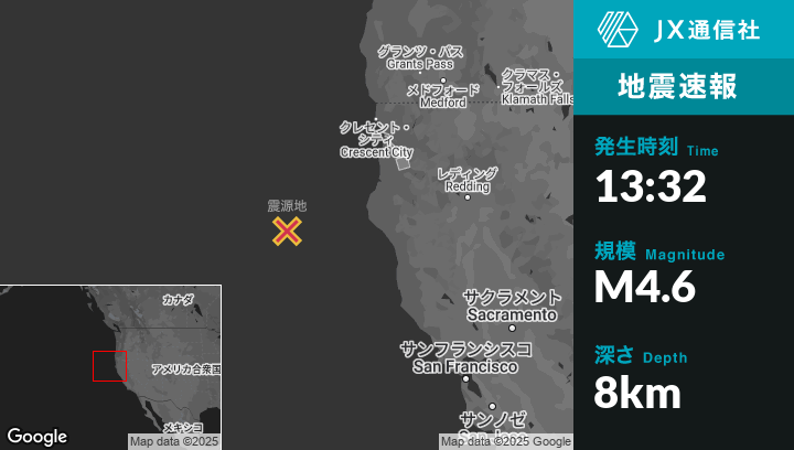 2月12日 13:32頃、カリフォルニアのFerndaleから西南西153kmの地点でM4.6の地震がありました。