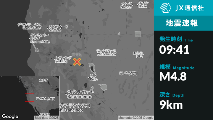 12月29日 09:41頃、カリフォルニアのSusanvilleから北北西14kmの地点でM4.8の地震がありました。
