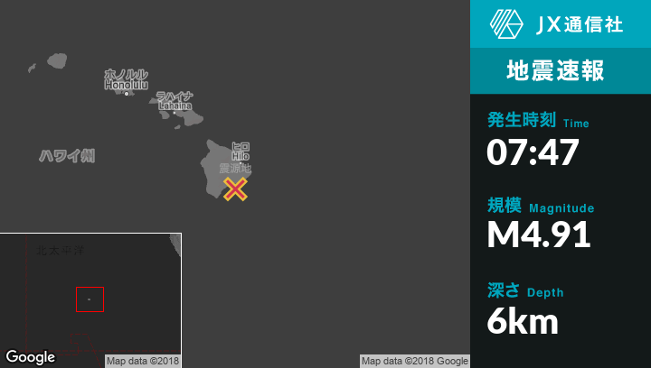 5月05日 07:47頃、ハワイのVolcanoから南20kmの地点でM4.91の地震がありました。