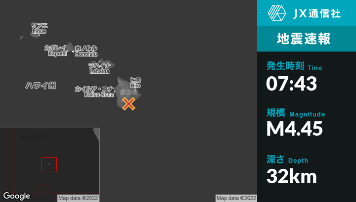 9月28日 07:43頃、ハワイのPāhalaから東北東9kmの地点でM4.45の地震がありました。
