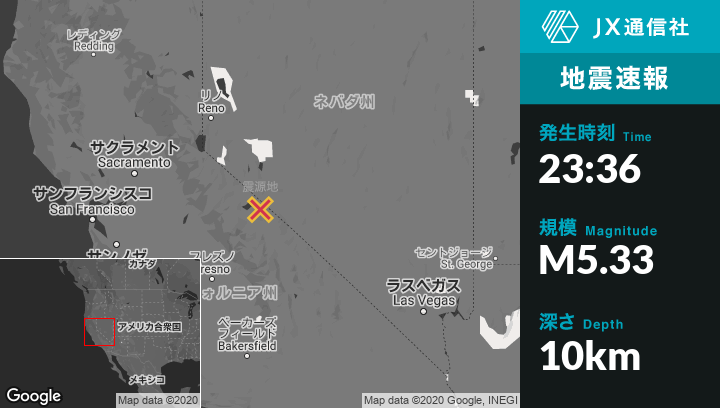 | 震源地 | カリフォルニアのBridgeportから東南東48kmの地点 |