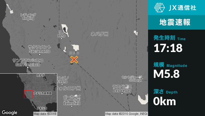 12月28日 17:18頃、ネバダ州のHawthorneから南西27kmの地点でM5.8の地震がありました。