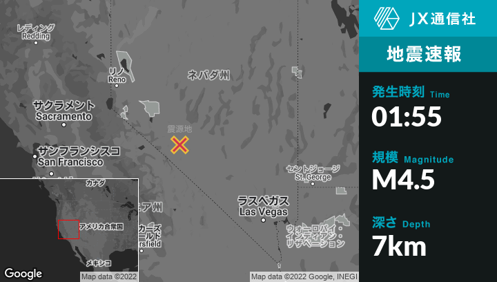 6月17日 01:55頃、ネバダのMinaから南東34kmの地点でM4.5の地震がありました。