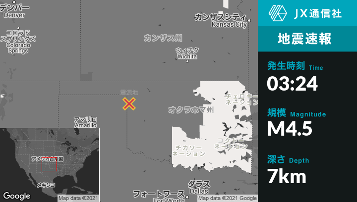 5月26日 03:24頃、オクラホマのShattuckから西北西3kmの地点でM4.5の地震がありました。