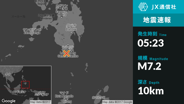 4月29日 05:23頃、フィリピンのPangyanから南西34kmの地点でM7.2の地震がありました。
