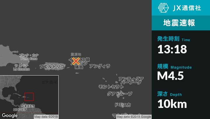 9月12日 13:18頃、米領バージン諸島のCharlotte Amalieから北41kmの地点でM4.5の地震がありました。
