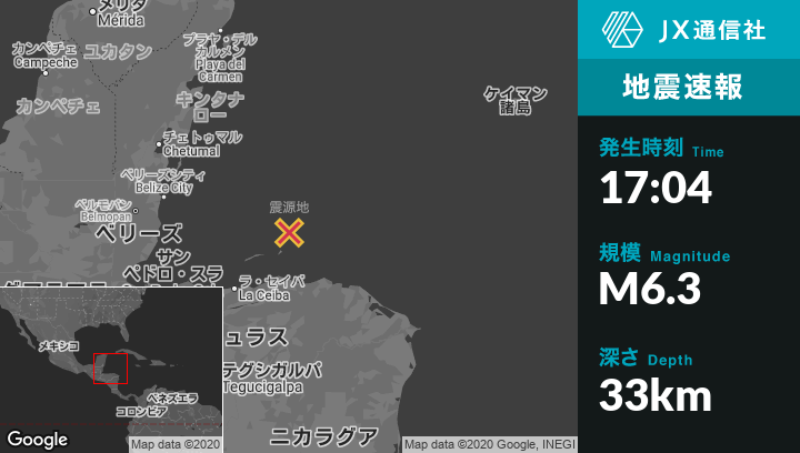 | 震源地 | ホンジュラスのSavannah Bightから北北東57kmの地点 |