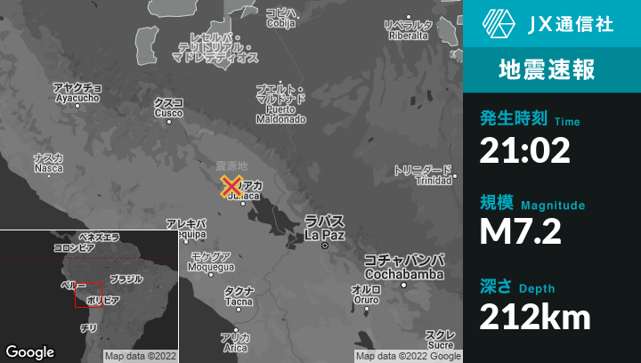 5月26日 21:02頃、ペルーのTirapataから西2kmの地点でM7.2の地震がありました。