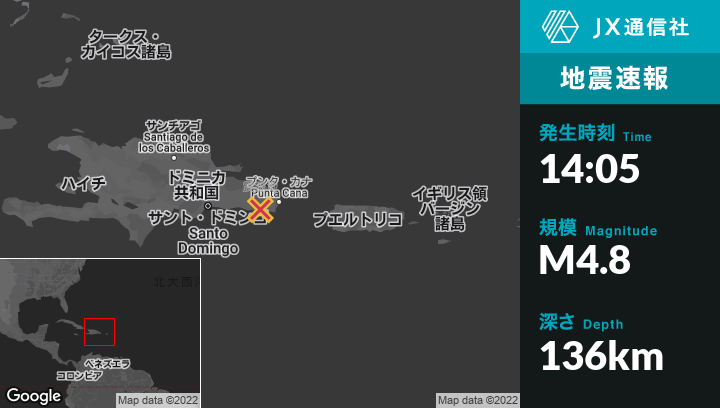 10月23日 14:05頃、ドミニカ共和国のSalvaleón de Higüeyから南西13kmの地点でM4.8の地震がありました。