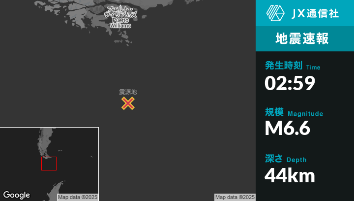 5月03日 02:59頃、アルゼンチンのUshuaiaから南南東285kmの地点でM6.6の地震がありました。