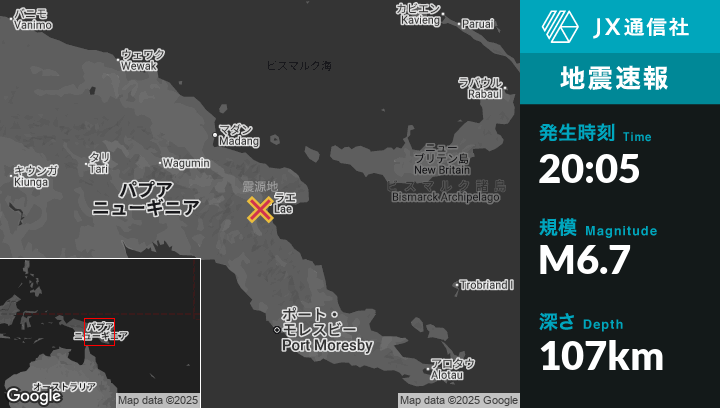 | 震源地 | パプアニューギニアのLaeから西23kmの地点 |