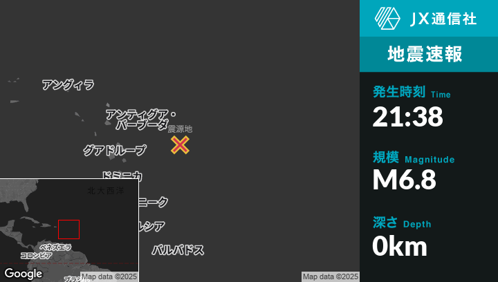 10月27日 21:38頃、グアドループのBeauséjourから東170kmの地点でM6.8の地震がありました。