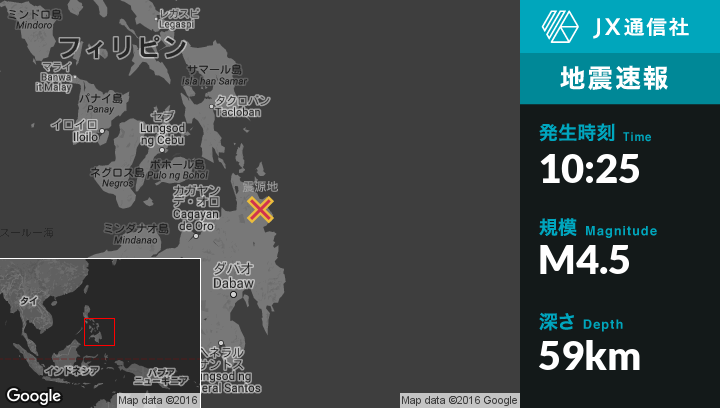 9月18日 10:25頃、フィリピンのCarmenから南9kmの地点でM4.5の地震がありました。