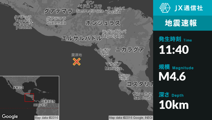 11月25日 11:40頃、エルサルバドルのPuerto El Triunfoから南南西131kmの地点でM4.6の地震がありました。