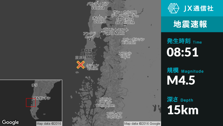 12月29日 08:51頃、チリのPuerto Quellonから西69kmの地点でM4.5の地震がありました。