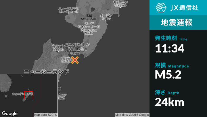 12月29日 11:34頃、ニュージーランドのBrooklynから南南西42kmの地点でM5.2の地震がありました。