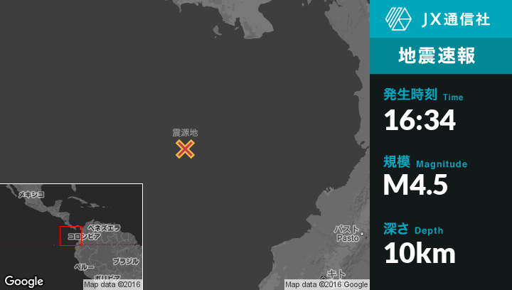 12月30日 16:34頃、パナマのPunta de Buricaから南451kmの地点でM4.5の地震がありました。