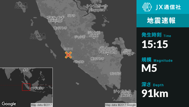 | 震源地 | インドネシアのSungaipenuhから南87kmの地点 |