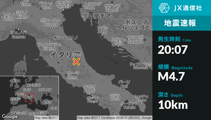 1月18日 20:07頃、イタリアのArquata del Trontoから南南西2kmの地点でM4.7の地震がありました。