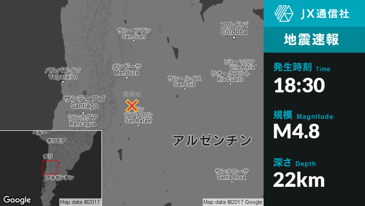 | 震源地 | アルゼンチンのSan Martinから南82kmの地点 |