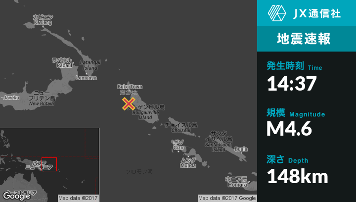 1月22日 14:37頃、パプア ニューギニア独立国のArawaから西北西107kmの地点でM4.6の地震がありました。