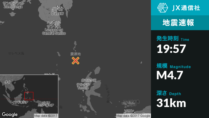 | 震源地 | インドネシアのTobeloから北西210kmの地点 |