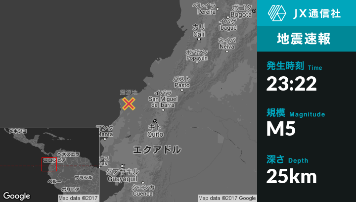 1月31日 23:22頃、エクアドルのPropiciaから南24kmの地点でM5の地震がありました。