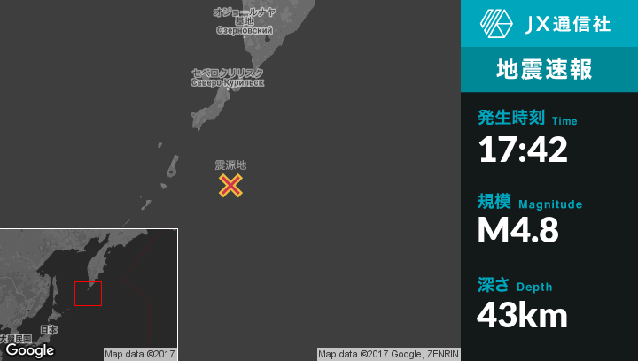 4月20日 17:42頃、ロシアのSevero-Kuril'skから南163kmの地点でM4.8の地震がありました。