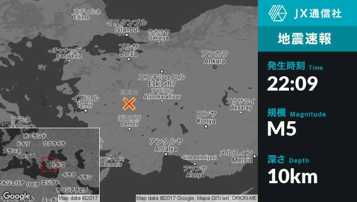 4月21日 22:09頃、トルコのSelendiから東17kmの地点でM5の地震がありました。