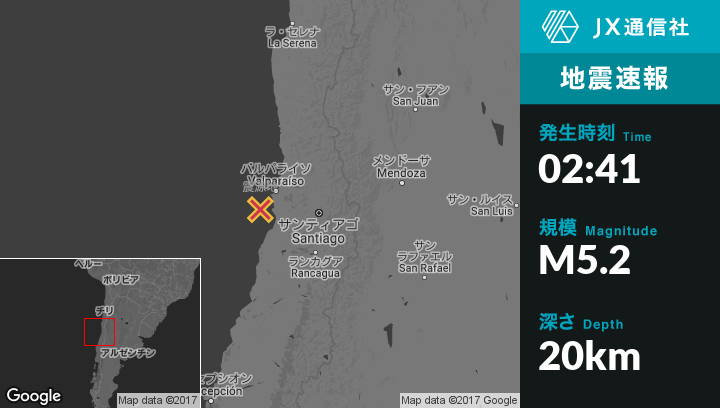 4月29日 02:41頃、チリのValparaisoから南西41kmの地点でM5.2の地震がありました。